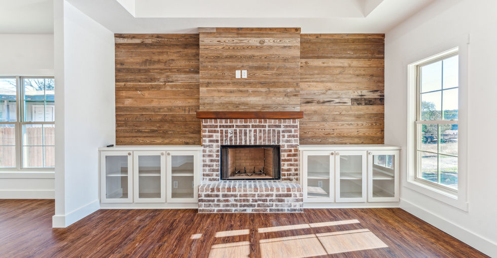 "Granbury 2" is a craftsman style home with 3 bedrooms and two bathrooms. It has mixed textured siding and exposed rafter-tails on the exterior with a covered back porch. The living area features a wood burning fireplace with a reclaimed wood accent wall. Upgraded countertops and stainless steel appliances in the kitchen. Each bedroom has a walk in closet and brass hardware throughout.